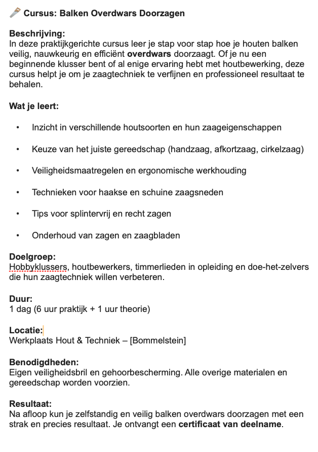 In deze praktijkgerichte cursus leer je stap voor stap hoe je houten balken veilig, nauwkeurig en efficiënt overdwars doorzaagt. Of je nu een beginnende klusser bent of al enige ervaring hebt met houtbewerking, deze cursus helpt je om je zaagtechniek te verfijnen en professioneel resultaat te behalen.
